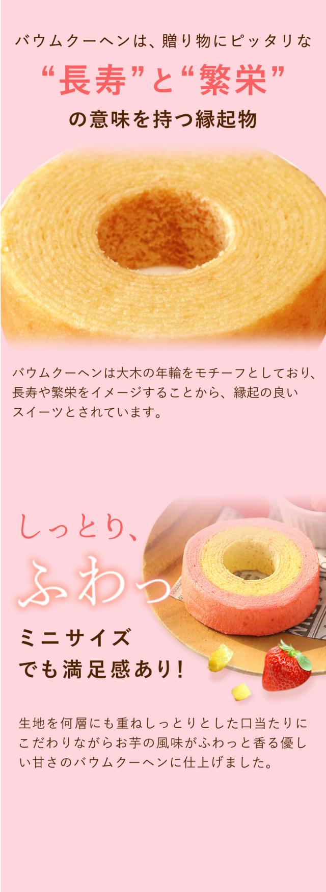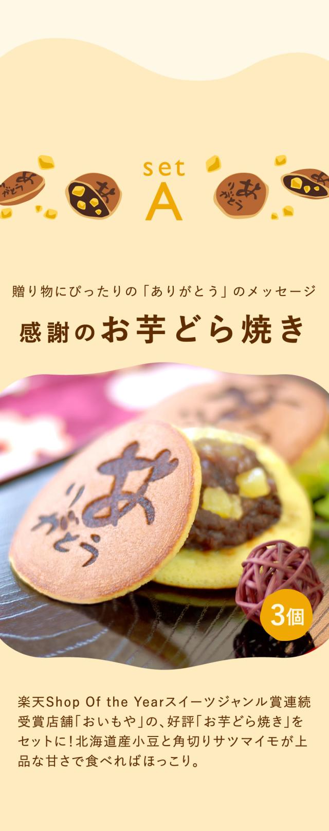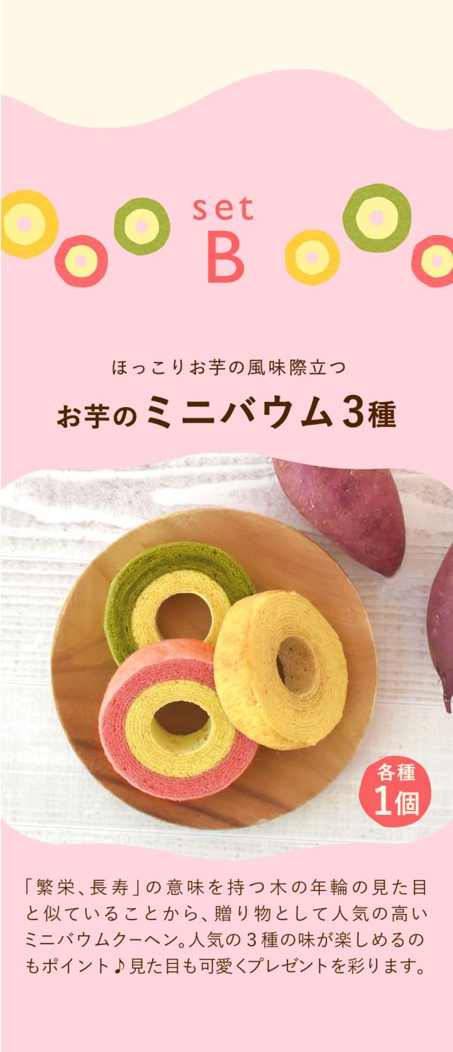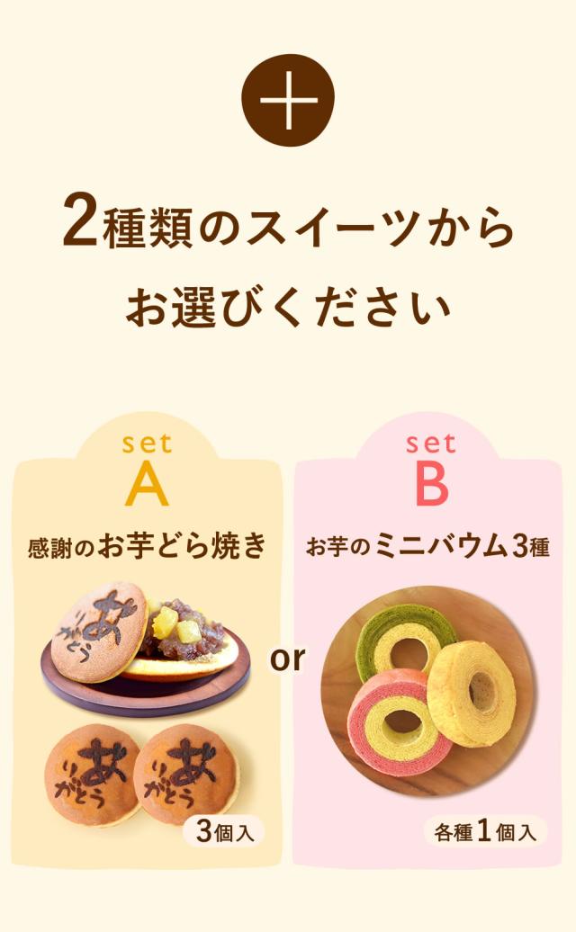 | 商品内容 | [Aセット] ・スイートポテトプリン 3個 ・お芋どらやき 3個 [Bセット] ・スイートポテトプリン 3個 ・スイートポテトバウムクーヘン……1個 ・苺バウムクーヘン……1個 ・抹茶バウムクーヘン……1個 |