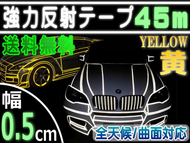 反射テープ (黄) 5mm 【メール便 送料無料】 長さ45m 幅0.5cm リフレクトラインテープ イエロー 夜間 リフレクター シート デコライン 強力ステッカー シール 防水 内装 外装 曲面 ストライプ 高反射 リフレクトステッカー 高輝度 光るテープ 夜 屋外 車 自動車 車用 バイク