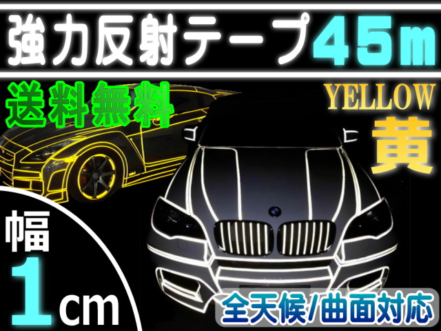 反射テープ (黄) 1cm 【メール便 送料無料】 長さ45m 幅10mm リフレクトラインテープ イエロー 夜間 リフレクター シート デコライン 強力ステッカー シール 防水 内装 外装 曲面 ストライプ 高反射 リフレクトステッカー 高輝度 光るテープ 夜 屋外 車 自動車 車用 バイク