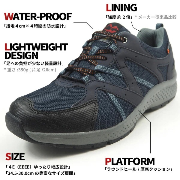 | 特徴 | ムーンスターのメンズ防水スニーカー。 雨の日でも履ける「4cm 4時間防水」機能に加え、つま先がゆったりした4Eの幅広設計・屈曲性が良くて歩きやすい独自ソール。 ウォーキングやお仕事、旅行やレジャーなどに幅広く対応します。 | |||||||