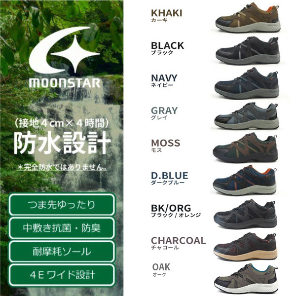 ■カラーカーキ ブラック ネイビー グレイ モス ダークブルー ブラック/オレンジ チャコール オーク■サイズ24.5cm 25.0cm 25.5cm 26.0cm 26.5cm 27.0cm 28.0cm 29.0cm 30.0cm■商品説明ムーンスターのメンズ防水スニーカー。雨の日でも履ける「4cm 4時間防水」機能に加え、つま先がゆったりした4Eの幅広設計・屈曲性が良くて歩きやすい独自ソール。ウォーキングやお仕事、旅行やレジャーなどに幅広く対応します。■キーワード1110112★ KHAKI BLACK NAVY GRAY MOSS D.BLUE BK/ORG CHARCOAL