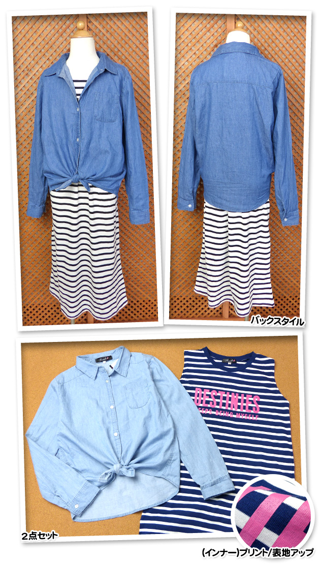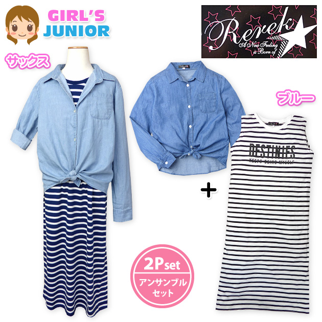 子供服 女の子 シャツ ワンピース 長袖 ノースリーブ Rerek レレク アンサンブル 裾縛り ボーダー 女児 ジュニア