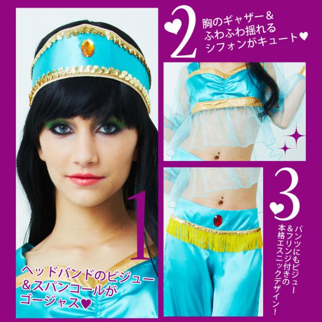 透け感のある袖が可愛く、露出度が高過ぎないのもポイント。鮮やかなエメラルドグリーンのアラビアンなお姫様衣装です。ゴールドのスパンコールの付いたゴージャスなヘアバンドと、ぷっくり膨らんだアラビアンパンツが本格的です。