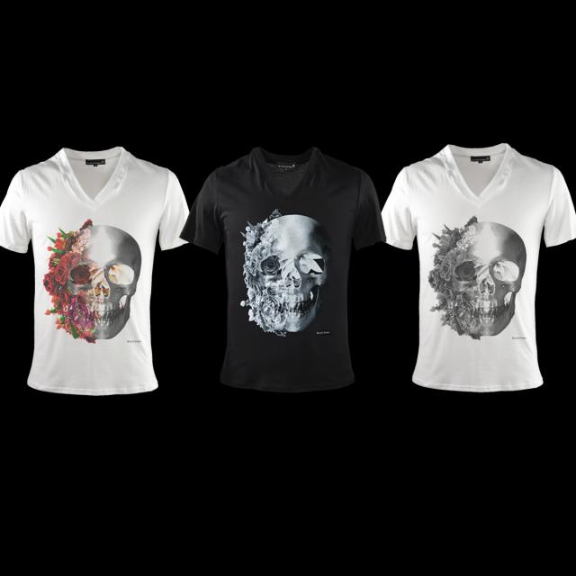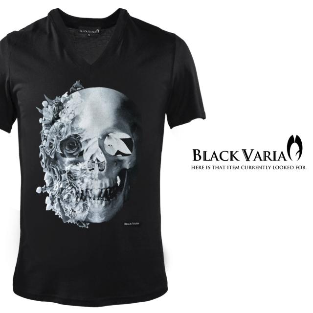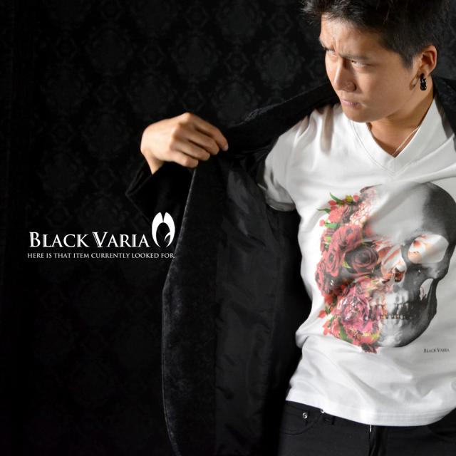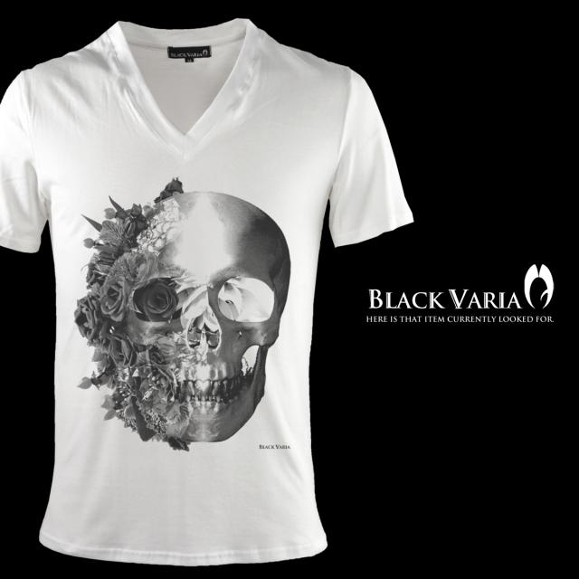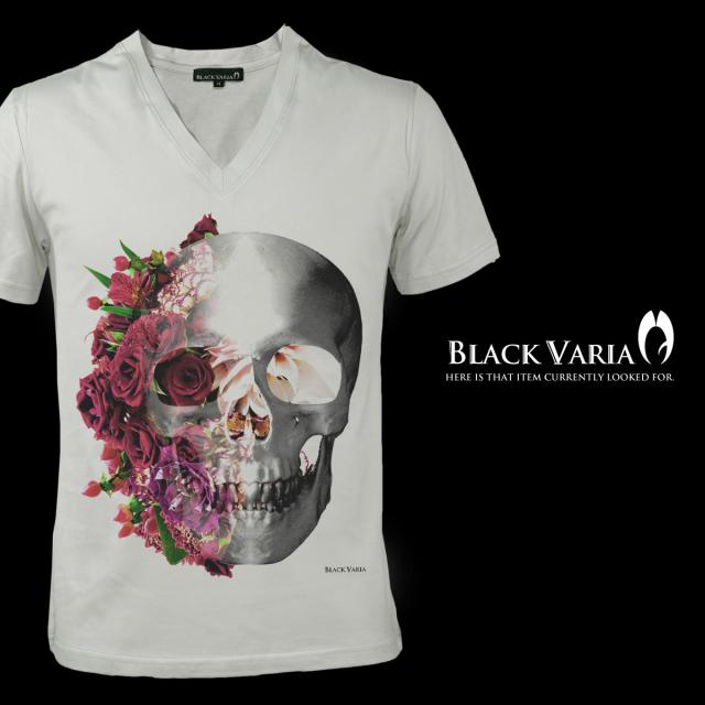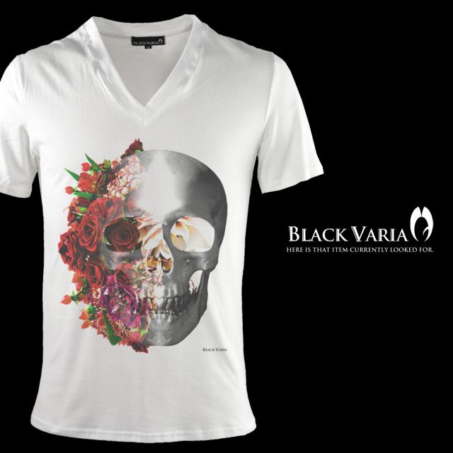 メール便可/1枚まで Tシャツ 半袖 Vネックバラ薔薇柄スカルドクロ(ホワイト白レッド赤) zkk023/日本製Vネックカットソー