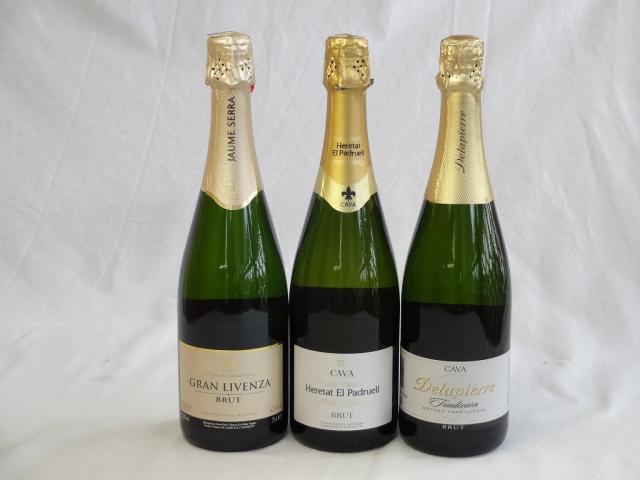 スパークリングワイン白辛口3本セット ハウメ・セラ ブリュット スペインスパークリングワイン750ml・エレタット・エル・パドルウェル カヴァ ブリュット 白(スペイン) 辛口750ml・デラピエ・ブリュット 750ml 750ml×3本●●●★ハウメ・セラ ブリュット・ナチューレ 750ml 辛口 (スペイン) ☆ゴールドの輝きのあるレモンイエロー。フレッシュなハーブ、柑橘、蜂蜜、熟成した澱の印象のアロマ。★エレタット エル パドゥルエル ブリュット750ml辛口 (スペイン)☆青リンゴと柑橘類の香りが印象的でミネラルも感じさせます。口に含むと、フレッシュで爽やか、とても飲みやすくしっかりとしたストラクチャーです。後味にすっきりした余韻が残ります。★コドーニュ・ デラピエ ・ブリュット 750ml 辛口(スペイン・白)☆キリッとした口当たりの爽やかなカヴァ。辛口なので飲み飽きることがなく、いつまでも爽やかフレッシュ。華やかな香りが口の中で広がります。