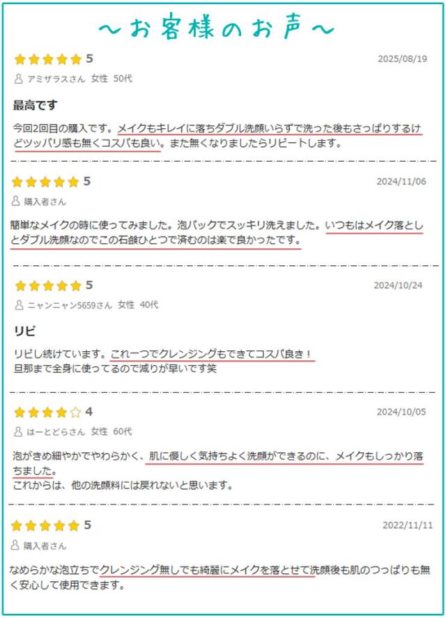 - 3個目の購入 泡立ちがすごーく良いですね 泡パックしても流れ落ちないのが気に入ってます