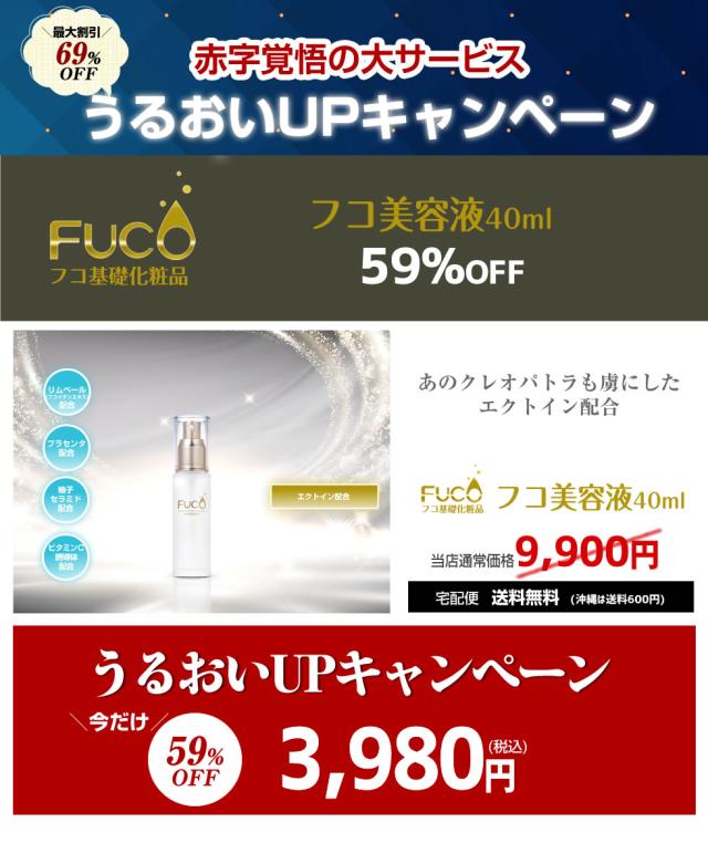 【フコ美容液40ml】\【※59%OFF※うるおいUPキャンペーン】/【宅配便】★今話題の高級成分【フコイダン】配合♪さらに!あのクレオパトラも虜にしたエクトイン配合♪ フコ化粧品 プラセンタエキス ビタミンC誘導体 柚子セラミド 送料別