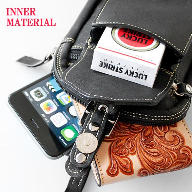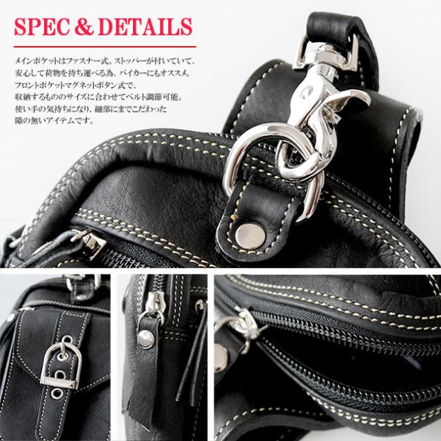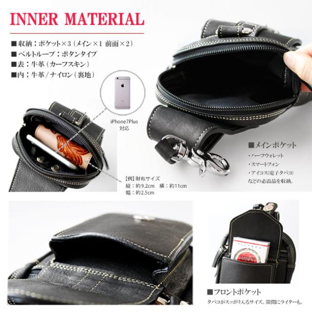 キメが細かくとても柔らかくて肌触りのいい上質のカーフスキン(子牛の革)を使用し、革職人がハンドメイドで製作しています。ベルトループはボタン式になっているため簡単に付け外しができます。スマホなどちょっとしたものを収納可能です。ストッパーがあるのでバイカーにもオススメです。本革ですので使い込むほどに革がなじみ、風合いが増していきます。