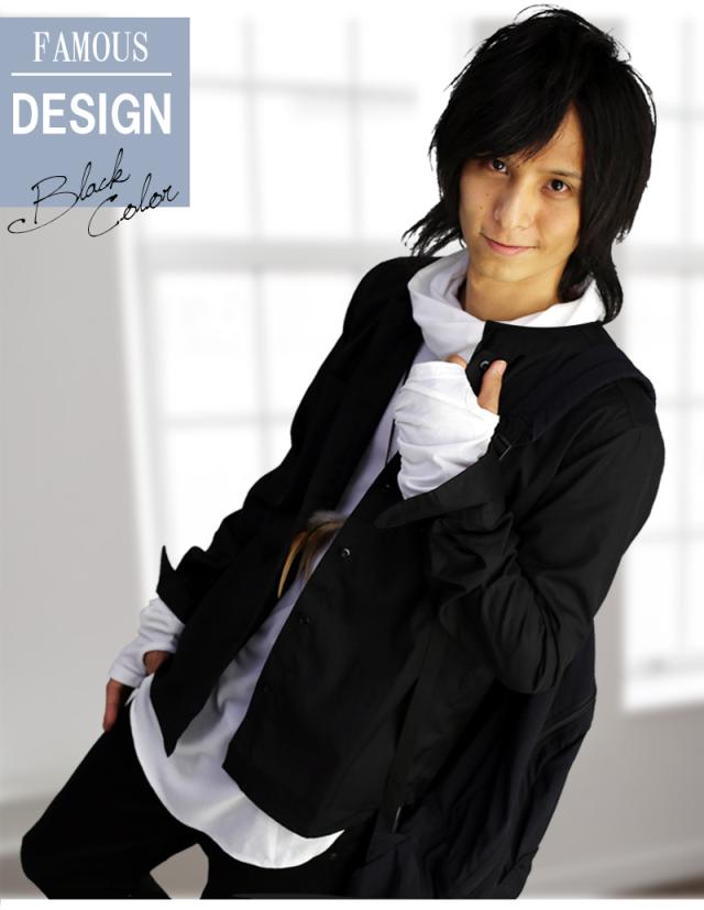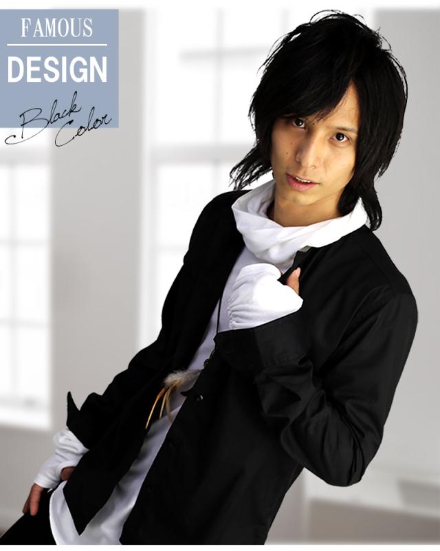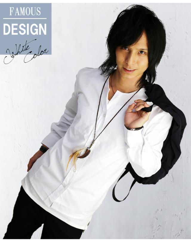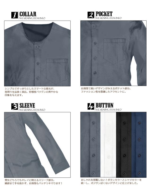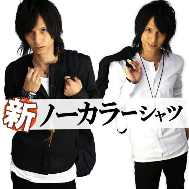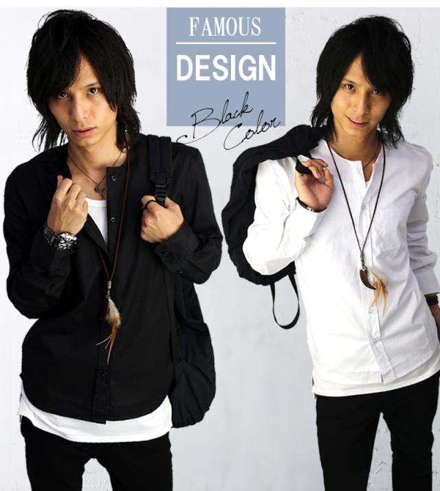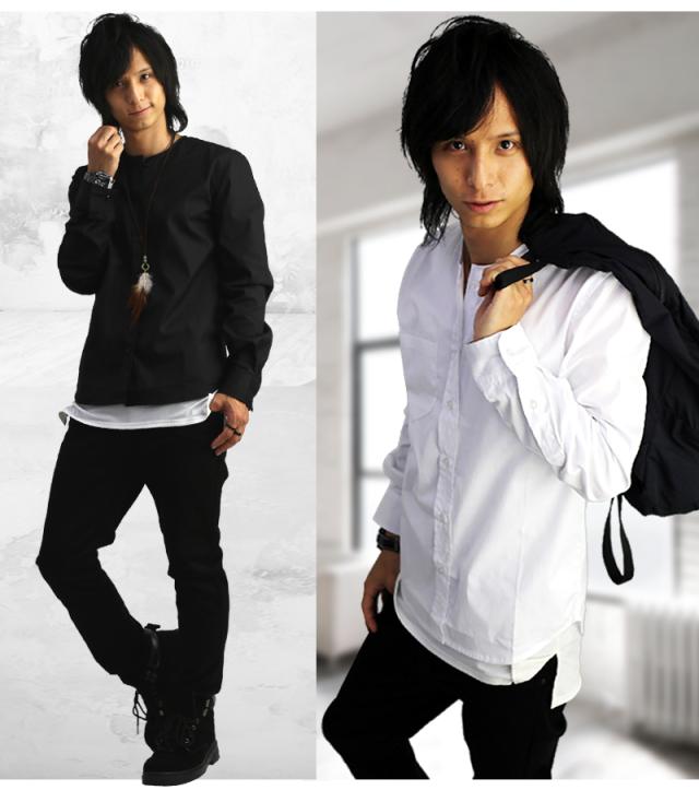 長袖ノーカラーシャツ 襟なしシャツ ノーカラー カジュアルシャツ 黒 白 トップス 無地 スリム メンズ服 モテシャツ【 f145-cr 】