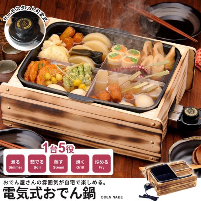 | 焼杉風の木枠とフタでおでん屋さんの雰囲気がご自宅で楽しめます。 おでん鍋としてだけでなく、煮る・茹でる・蒸す・焼く・炒めるの一台5役でオールシーズン使用OK。 設定温度より温度が上がりすぎたり下がりすぎたりすると、サーモスタットが働き、温度の調節をします。 ・温度調節ツマミ(低):約60-80℃ ・温度調節ツマミ(中):約100-150℃ ・温度調節ツマミ(高):約200-250℃ 内鍋は木枠から取り外して洗え、フッ素樹脂加工でお手入れも簡単。 型崩れを防げる仕切り板付。 |