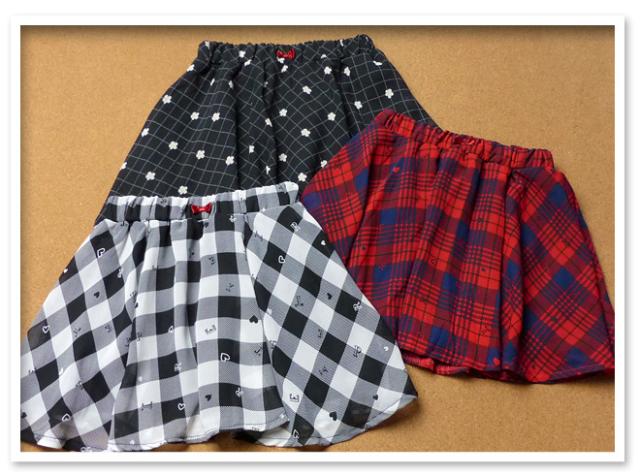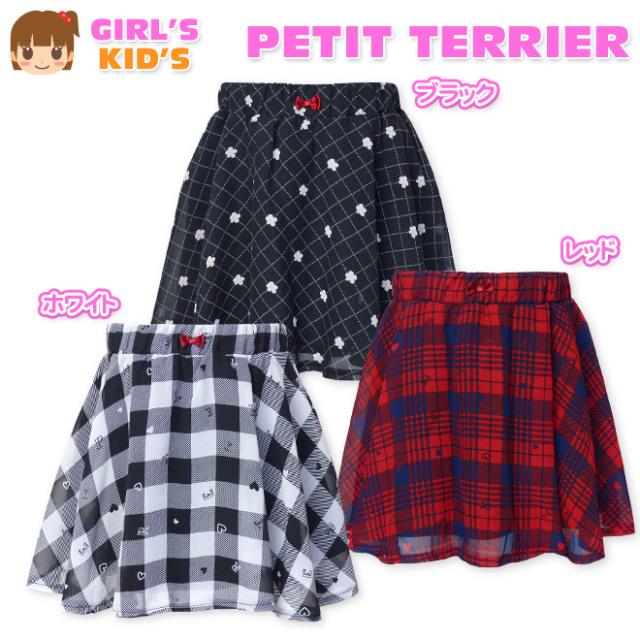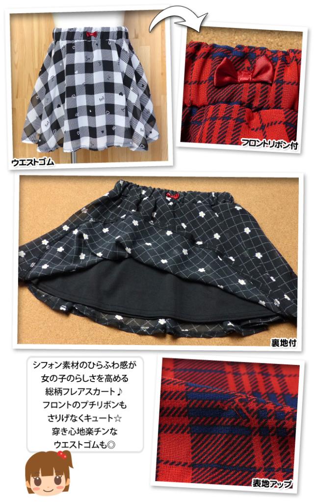 【送料無料】子供服 女の子 フレア スカート ボトム シフォン チェック柄 総柄 リボン装飾 ウエストゴム 女児 キッズ【メール便対応】