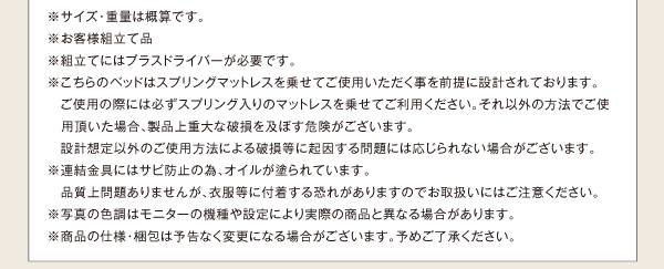 ご使用の際には必ずスプリング入りのマットレスを乗せてご利用ください。そて以外の方法でご使用頂いた場合、製品上重大な破損を及ぼす危険がございます。