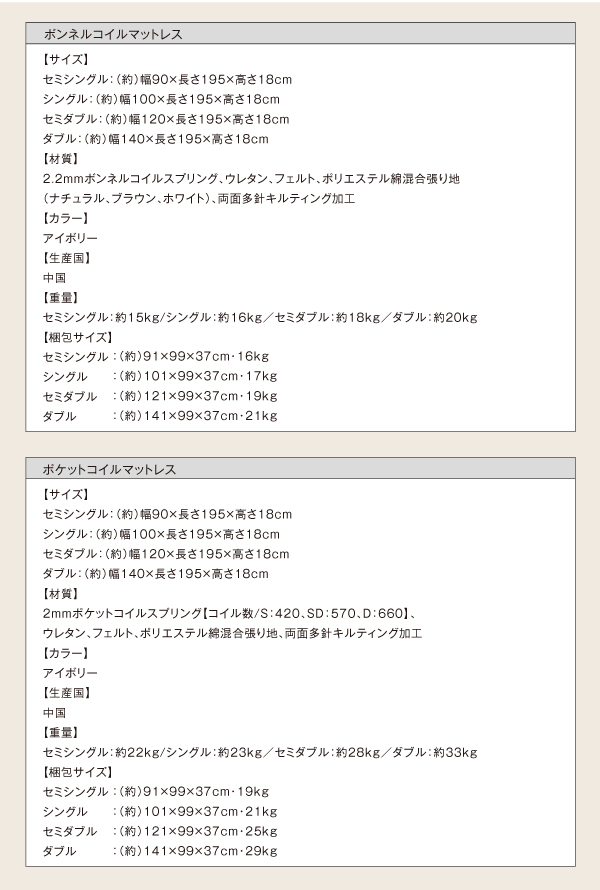 セミシングル:約15kg/シングル:約16kg/セミダブル:約18kg/ダブル:約20kg