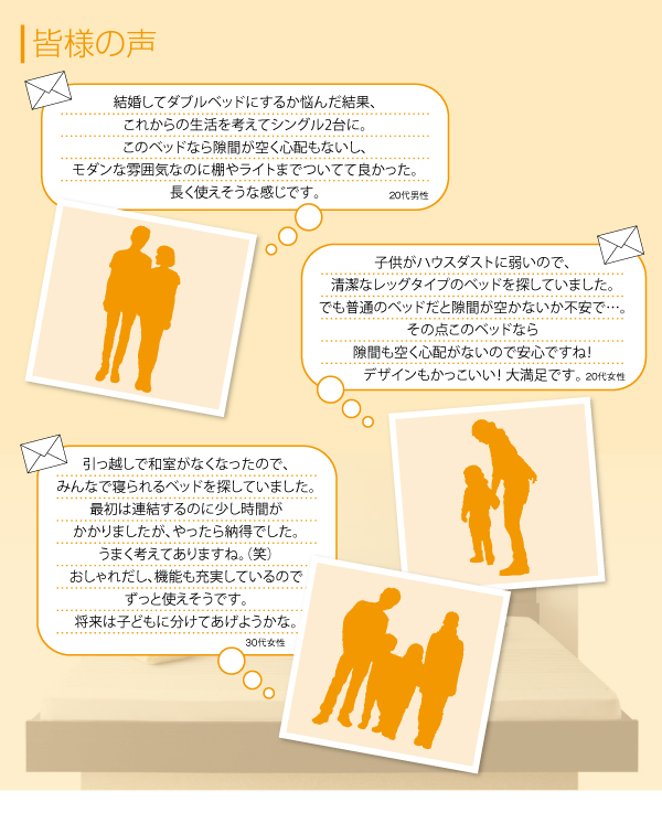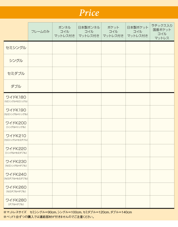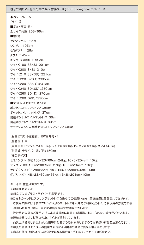 ご使用の際には必ずスプリング入りのマットレスを乗せてご利用ください。そて以外の方法でご使用頂いた場合、製品上重大な破損を及ぼす危険がございます。