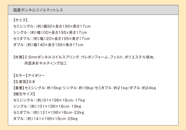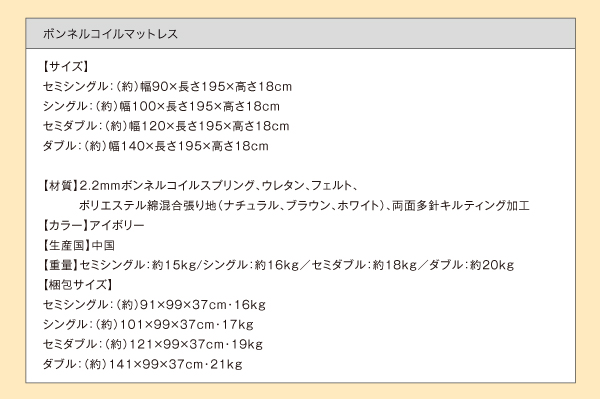 セミシングル:32kg/シングル:35kg/セミダブル:39kg/ダブル:43kg