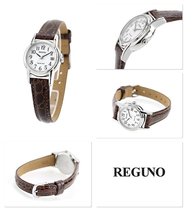 正規品 7年保証キャンペーン シチズン レグノ ソーラーテック レディス ストラップ KH4-815-10 CITIZEN REGUNO 腕時計 アナログ ホワイト×ブラウン レグノより、ビジネスからカジュアルまでシーンを選ばない、デザイン性と機能性を兼ね備えたスタンダードウォッチです。ソーラーテック搭載のため、定期的な電池交換が不要。オールアラビア数字採用のインデックスは視認性が高く、3時位置に配置したカレンダー表示が実用性を確保しています。小ぶりで華奢なデザインが、腕もとで女性らしい可愛らしさを演出します。 発売日:15年9月発売