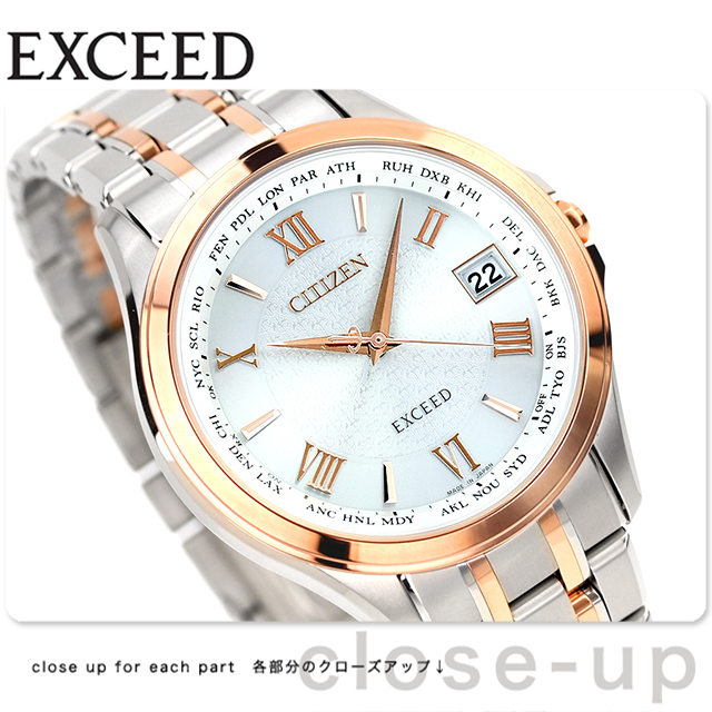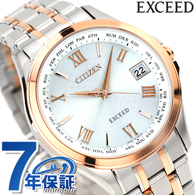 正規品 7年保証キャンペーン 送料無料 シチズン エクシード エコ・ドライブ電波 CB1084-51A CITIZEN EXCEED ペアウォッチ メンズ 腕時計 アナログ シルバー×ピンクゴールド エクシードらしい、薄型でエレガントなグローバル電波対応のペアウォッチです。丸みをおびたフォルムにすることで、エレガントでありながら親しみを感じさせるデザインに仕上げています。綿密に設計された、薄くしなやかなチタニウムバンドを採用。文字盤は、ローマ数字とバーインデックスを組み合わせることで、視認性を確保しながらエレガントなデザインを実現しています。ケース、バンドにはデュラテクト加工を施すことで、時計本来の輝きや仕上げの美しさを保護します。サファイアガラスに99% クラリティ・コーティングを施すことによって、高い視認性を確保。耐久性と防汚性も優れています。金属アレルギーに対応した耐ニッケルアレルギー商品です。 発売日:15年10月発売