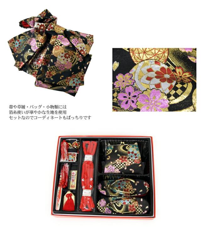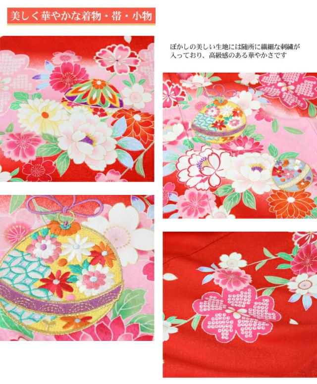 | 四つ身着物・作り帯・長襦袢・半衿・重ね衿・帯揚げ・帯締め・志古貴・草履・バッグ 箱迫・扇子・お守り・びら簪・肌着・裾除け・伊達締め2本・腰紐2本・コーリンベルト2本・足袋 | |||