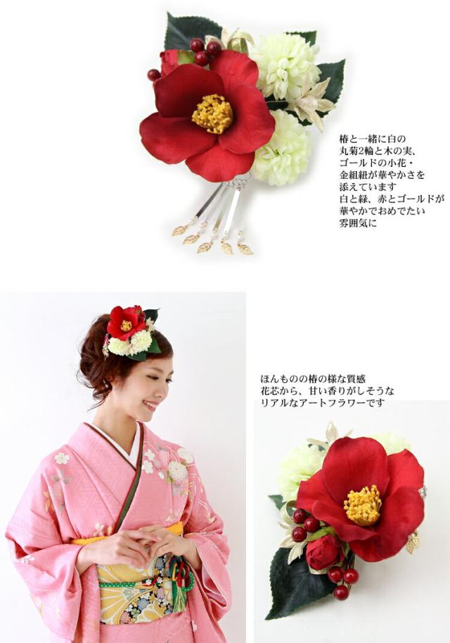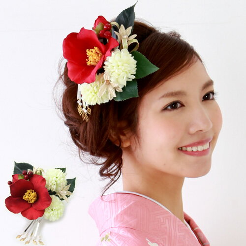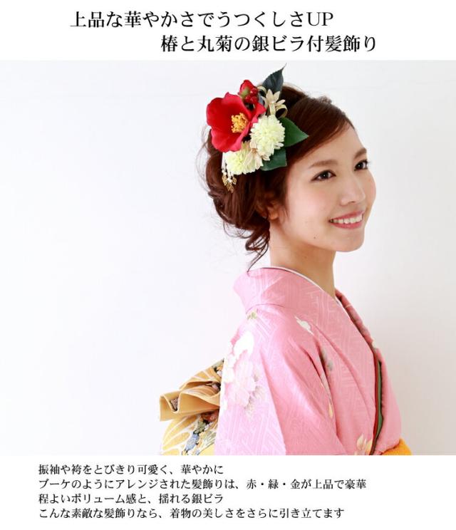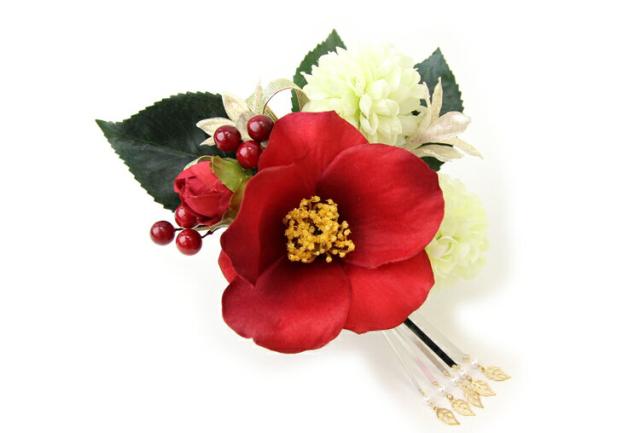 髪飾り 成人式 袴「椿と丸菊の銀ビラ付髪飾り」コーム コサージュ アートフラワー 赤 ゴールド 白 ヘアアクセサリー