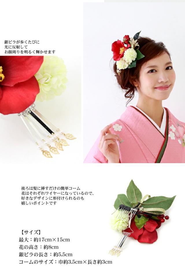 | サイズ | 最大:約17cm×15cm 花の高さ:約8cm 銀ビラの長さ:約5.5cm コームのサイズ:巾約3.5cm×長さ約3cm |
