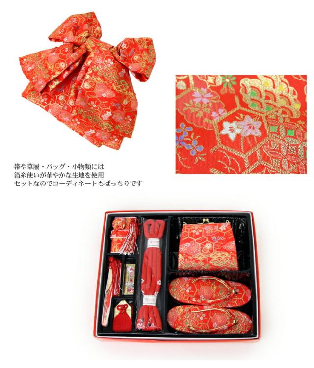 | 四つ身着物・作り帯・長襦袢・半衿・重ね衿・帯揚げ・帯締め・志古貴・草履・バッグ 箱迫・扇子・お守り・びら簪・肌着・裾除け・伊達締め2本・腰紐2本・コーリンベルト2本・足袋 | |||