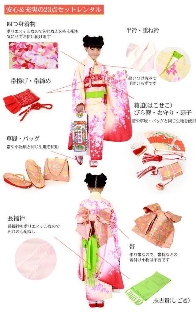 | 四つ身着物・作り帯・長襦袢・半衿・重ね衿・帯揚げ・帯締め・志古貴・草履・バッグ 箱迫・扇子・お守り・びら簪・肌着・裾除け・伊達締め2本・腰紐2本・コーリンベルト2本・足袋 | |||