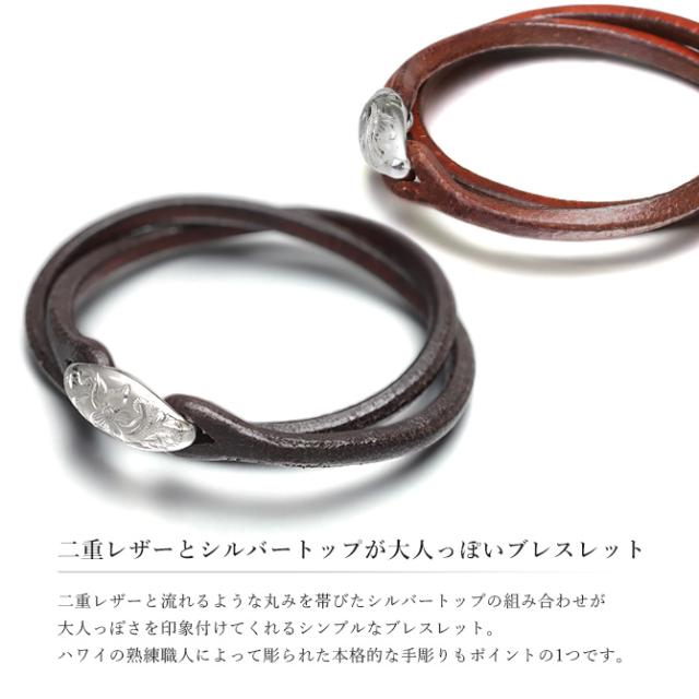 国産サドルレザーと、ハワイアンジュエリー「BY THE SEA」のハワイアン彫りが施されたシルバー留め金具を使用した、2重巻きブレスレットです。