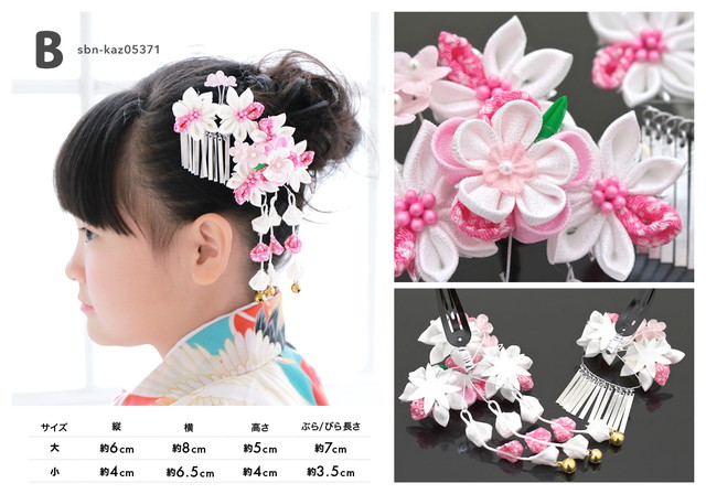 七五三 髪飾り 三歳 つまみ細工 2点セット 白 ピンク 桜 花 女の子 3才 7才 スリーピン パッチン留め 髪留め ヘアアクセサリー 和装