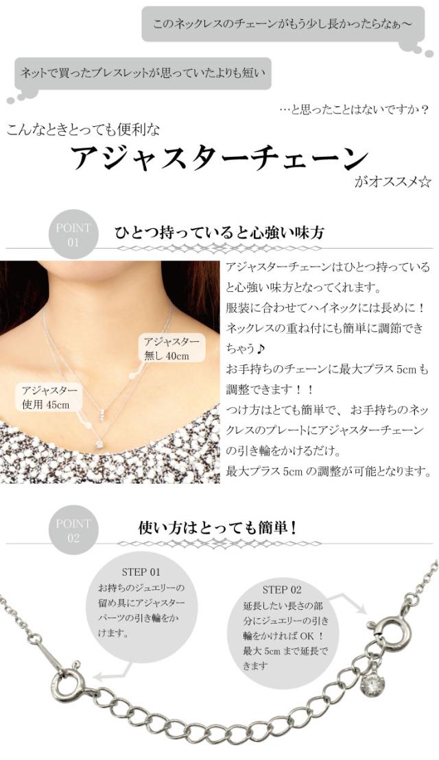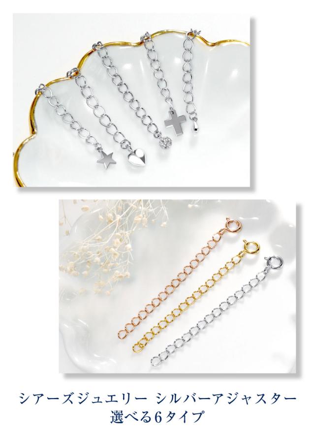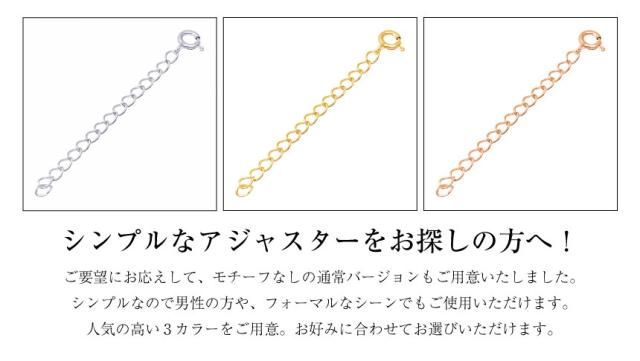 つけ方はとても簡単でお手持ちのネックレスのプレートにアジャスターチェーンの引き輪をかけるだけで最大プラス5cmの調整が可能となります。アジャスターのエンドパーツはドロップ、スター、ハート、一粒CZ、クロス、シンプルから選べるので日によってアレンジを変えても良いですね。