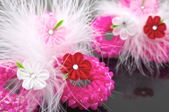お花や、ふわりとした羽飾りやラインストーンが華やかさを添えます。