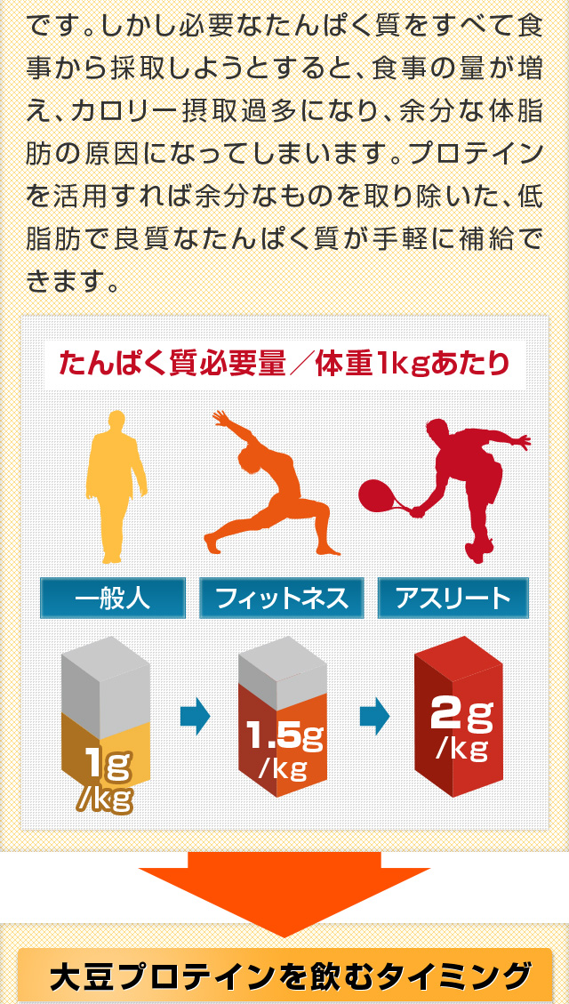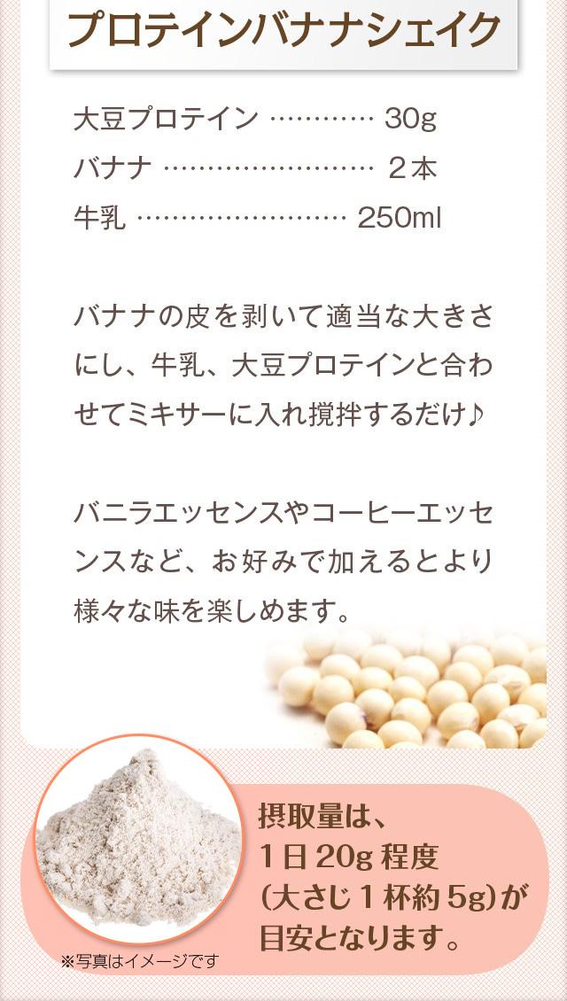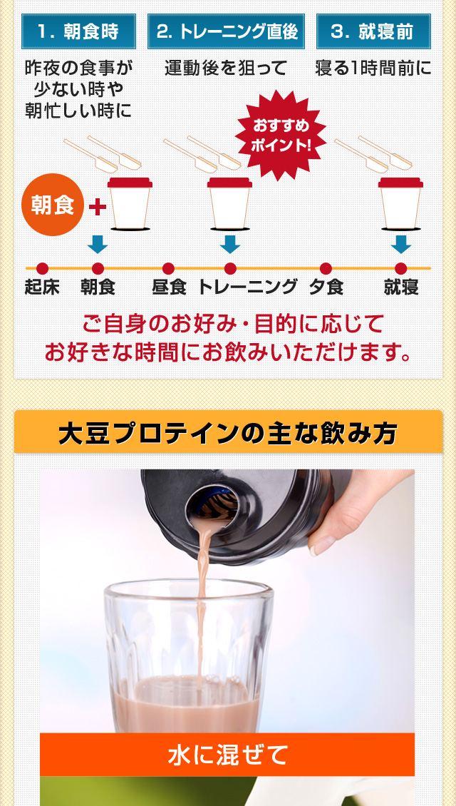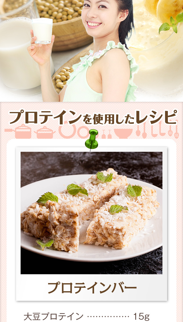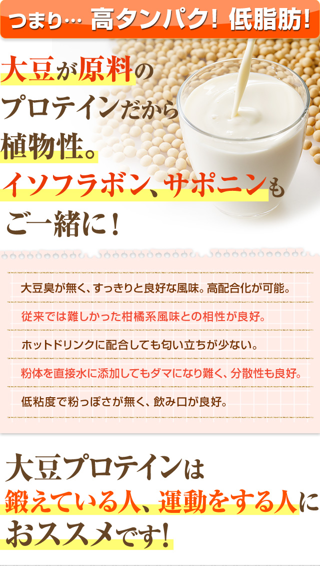 脂肪分が少なく、植物性のタンパク質を豊富に含んでいる大豆を原料としており、分解・吸収に比較的時間がかかり、ダイエット・理想的なカラダづくりをサポートします。