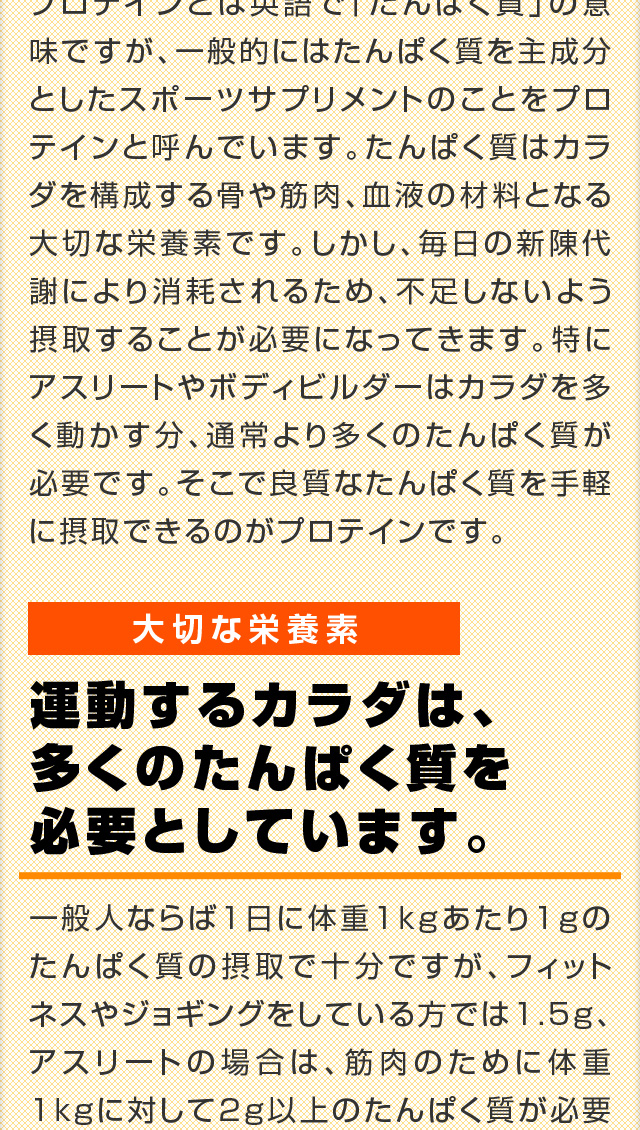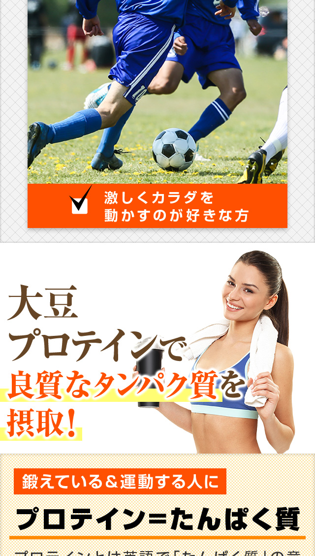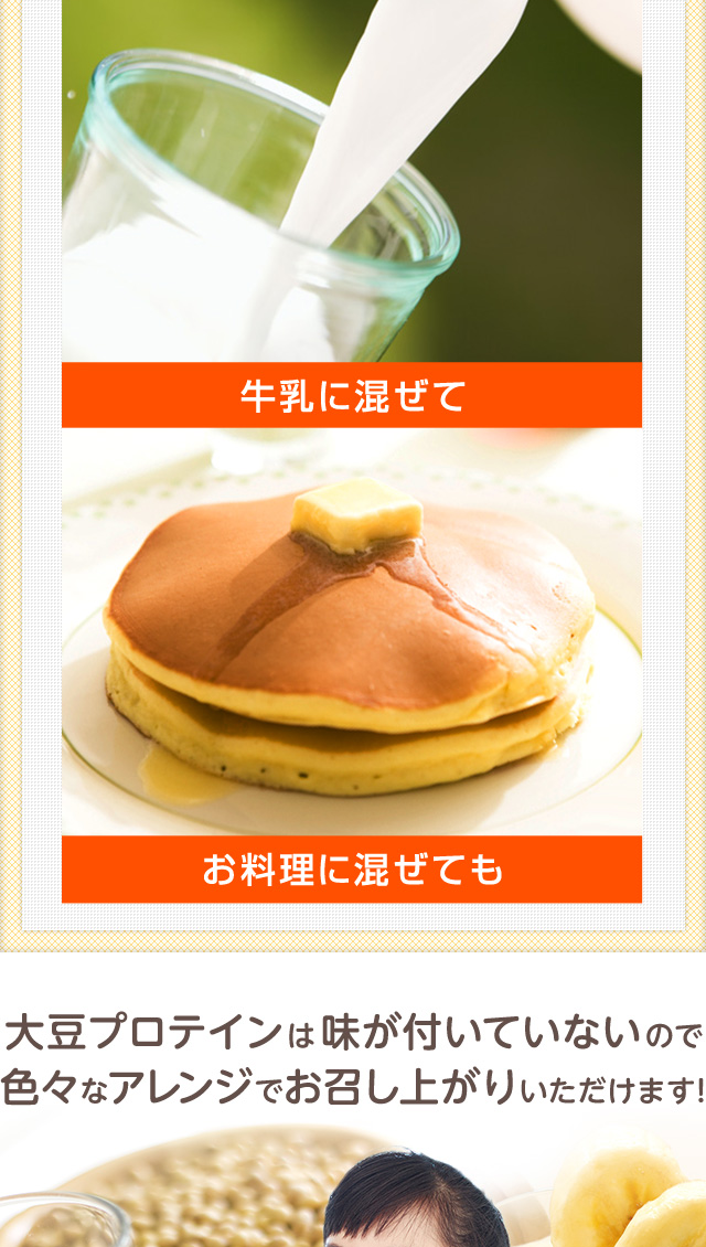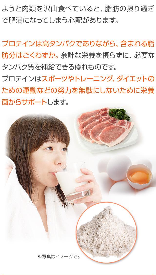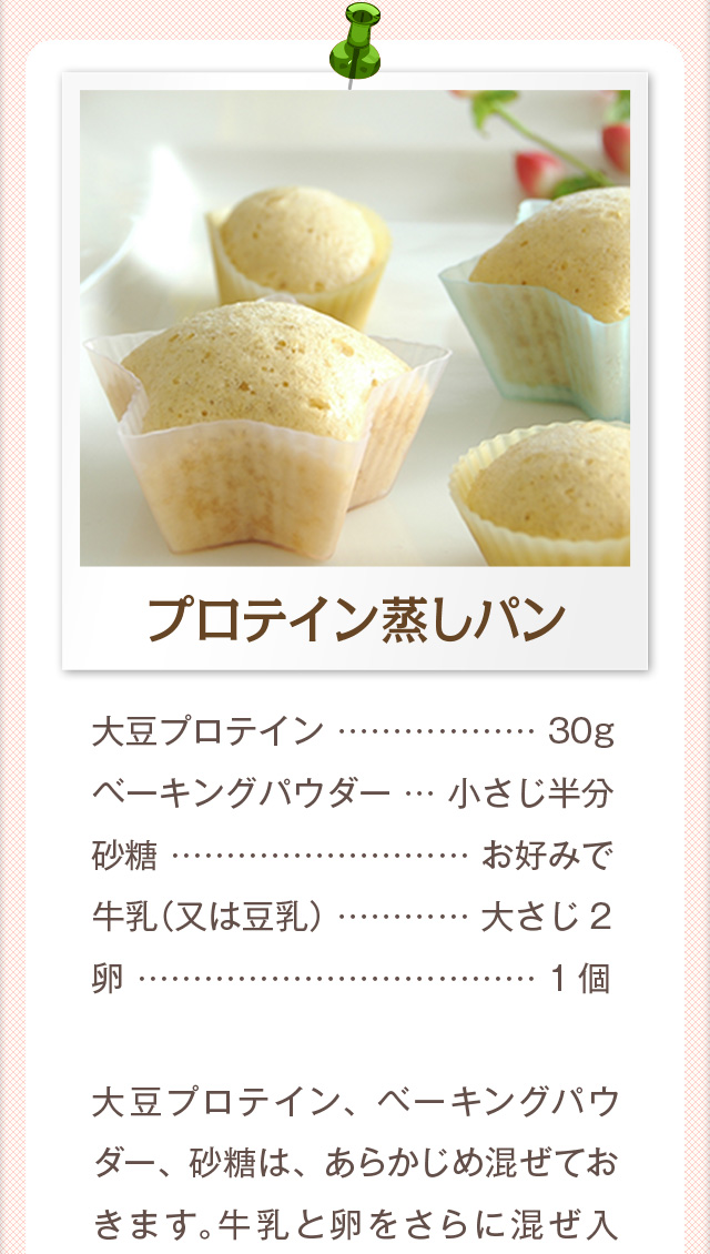 脂肪分が少なく、植物性のタンパク質を豊富に含んでいる大豆を原料としており、分解・吸収に比較的時間がかかり、ダイエット・理想的なカラダづくりをサポートします。