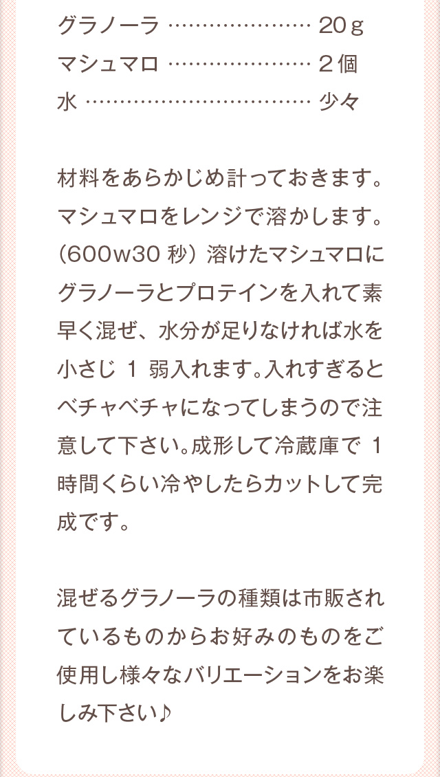 1回 約20g ※量は運動量・体重に応じて調整してください。 ・運動していない方 体重1kgあたり1g ・フィットネスをする方 体重1kgあたり1.5g ・スポーツ選手 体重1kgあたり2g |