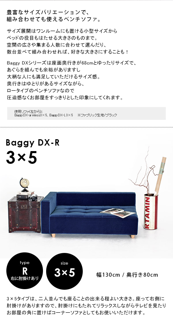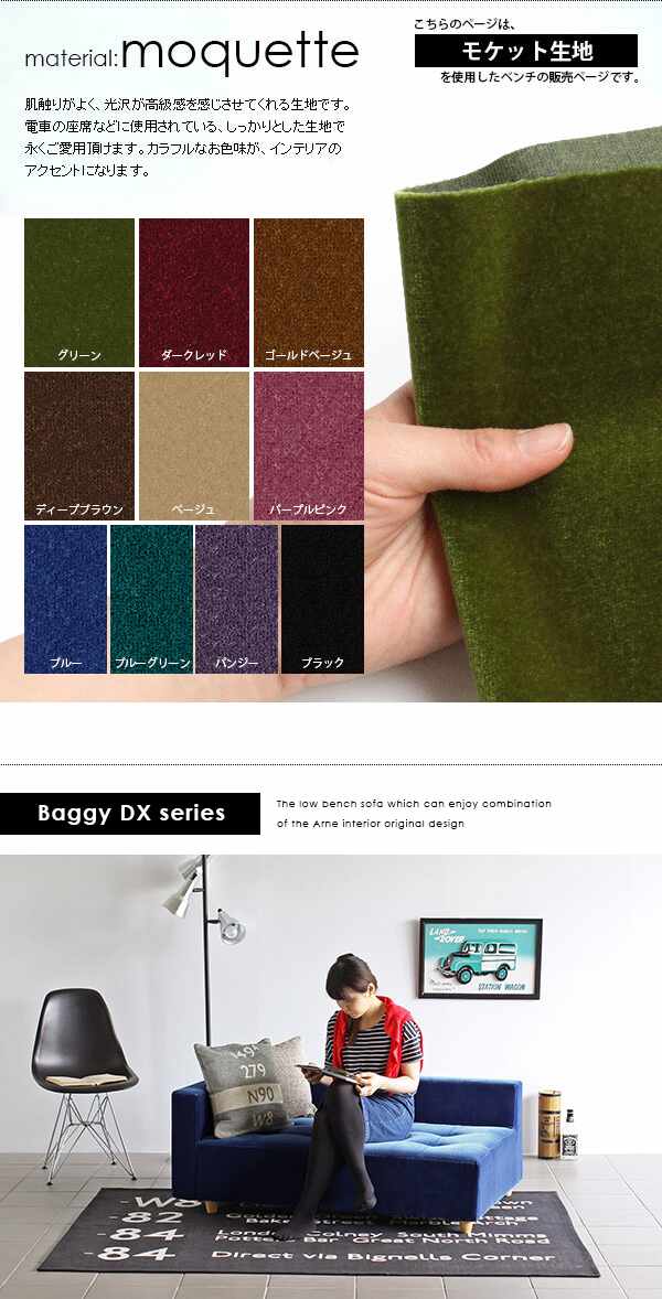 ベンチ椅子 片肘 ソファ ベンチ カフェ 北欧 コンパクト Baggy DX-R 3×5 モケット ベロア □