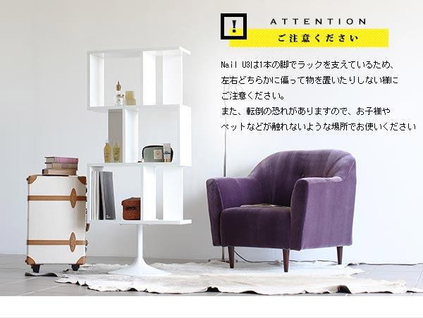 ※1本の脚でラックを支えているため、左右どちらかに偏って物を置いたりしない様にご注意ください。また、転倒の恐れがありますので、お子様やペットなどが触れないような場所でお使いください
