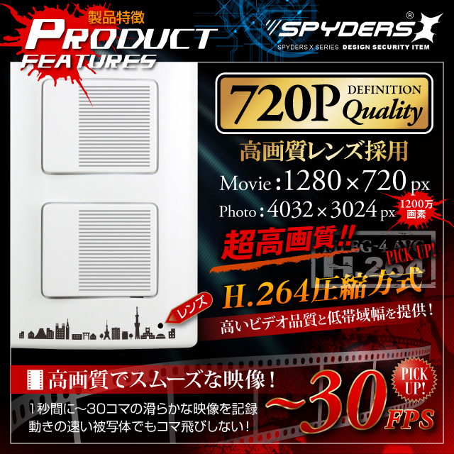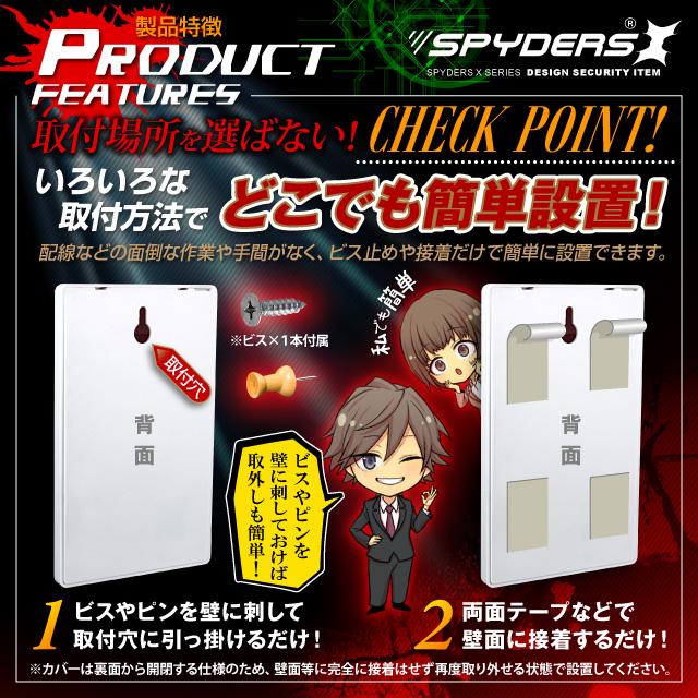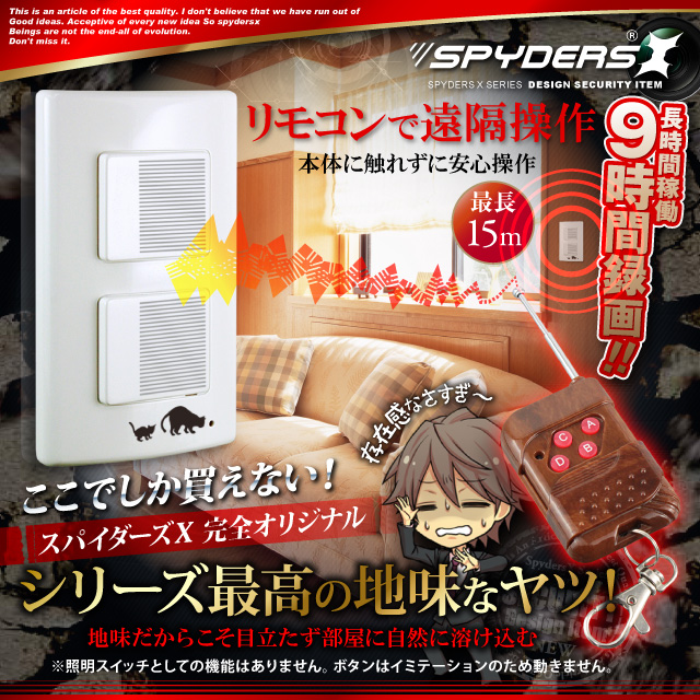 このスパイダーズXハイクオリティシリーズの照明スイッチ型ビデオカメラスパイダーズX 「H-777」は、コンセントやフックとは違うちょうどいい高さで、壁面から自然に撮影ができる照明スイッチ型のビデオカメラです。スパイダーズXの新シリーズ「ハイクオリティシリーズ」は、設計・組立・テストを日本でおこなったため(部品製造は韓国・中国)6ヶ月の長期保証を実現しました。記録解像度は、1280×720pixelの画質で動画を4032×3024pixel(約1200万画素)の画質で静止画を撮影ができます。操作は、付属のリモコンで操作が可能で、遠隔操作で怪しまれずに撮影可能です。