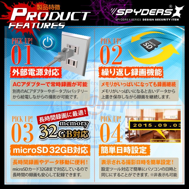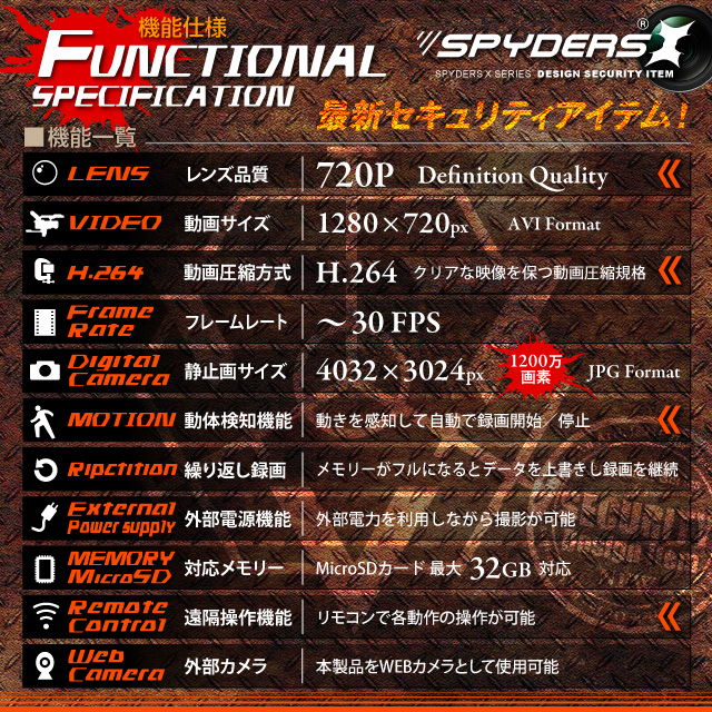 このスパイダーズXハイクオリティシリーズの照明スイッチ型ビデオカメラスパイダーズX 「H-777」は、コンセントやフックとは違うちょうどいい高さで、壁面から自然に撮影ができる照明スイッチ型のビデオカメラです。スパイダーズXの新シリーズ「ハイクオリティシリーズ」は、設計・組立・テストを日本でおこなったため(部品製造は韓国・中国)6ヶ月の長期保証を実現しました。記録解像度は、1280×720pixelの画質で動画を4032×3024pixel(約1200万画素)の画質で静止画を撮影ができます。操作は、付属のリモコンで操作が可能で、遠隔操作で怪しまれずに撮影可能です。メモリは大容量32GBのMicroSDカードに対応なので容量を気にせず撮影が可能です。また、撮影範囲内に動きを感知したら録画を開始する動体検知録画機能を搭載でメモリの無駄を省きながら録画したり、メモリがいっぱい人ると古いデータから上書きして録画を続ける繰り返し録画機能も搭載でメモリの容量を気にせず撮影ができます。 電源は、約12時間時間のUSBバスパワー充電もしくは、別売のACアダプターで約8時間の充電で録画を約9時間できます。