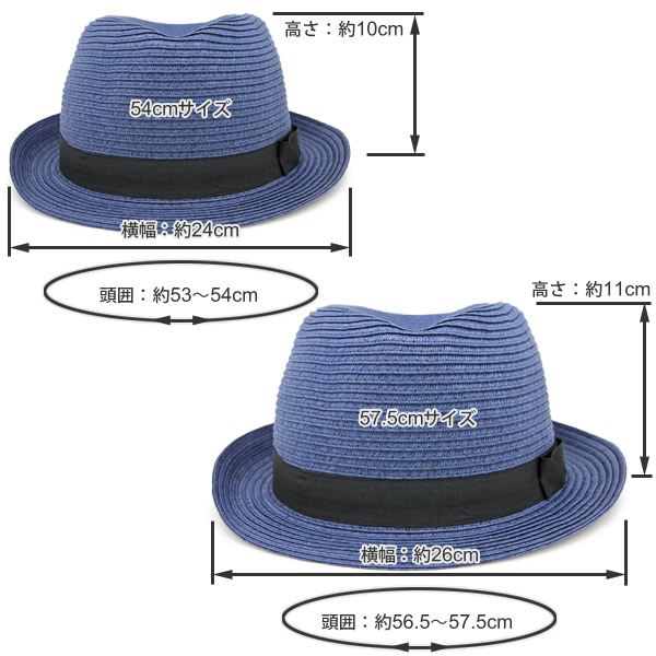 | サイズ | Sサイズ表記54cm(頭囲:約53〜54cm、高さ:約10cm、横幅:約24cm[つばも含む]、つばの長さ:約4.5cm) Mサイズ表記57.5cm(頭囲:約56.5〜57.5cm、高さ:約11cm、横幅:約26cm[つばも含む]、つばの長さ:約4.5cm) |