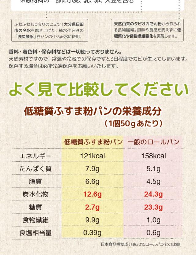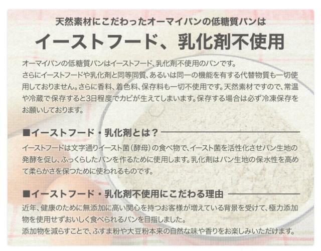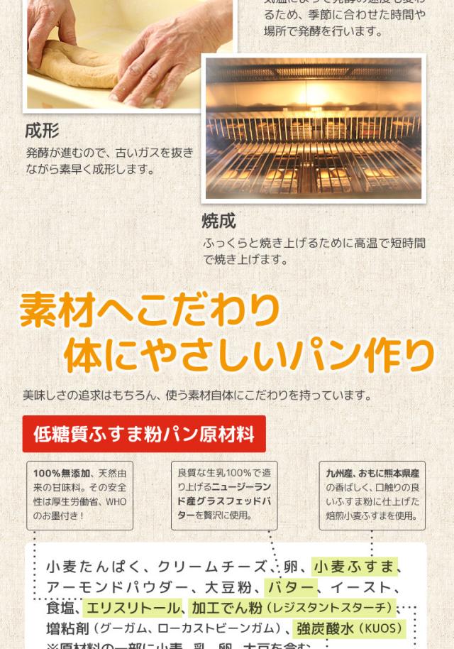 ・原材料:小麦たんぱく(オーストラリア産)、クリームチーズ、卵、小麦ふすま、アーモンドパウダー、大豆粉、バター、イースト、食塩、エリスリトール、加工でん粉(レジスタントスターチ)、増粘剤(グーガム、ローカストビーンガム)