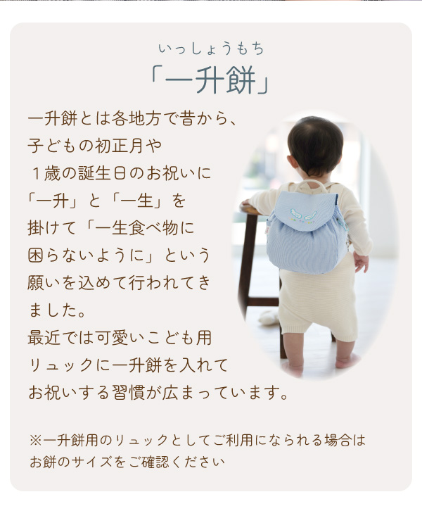 - 初孫の一歳の誕生日に一升餅を背負う為に購入しました。可愛らしいピンクで背負う姿が愛らしいです。小分けのお餅一升分しっかり入りました。長く使って欲しいと思います。素早い対応ありがとうございました。