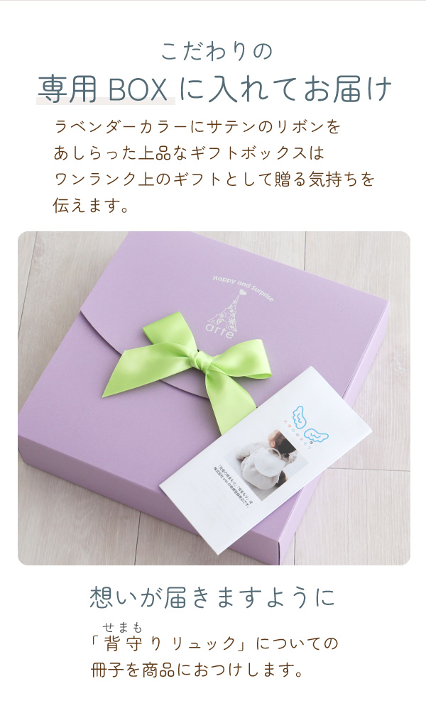 - 友人の出産祝いとして購入しました。包装紙などのラッピングはありませんでしたが、箱が可愛く贈り物向けでした。友人もリュックを見て「可愛い〜」と喜んでいました。