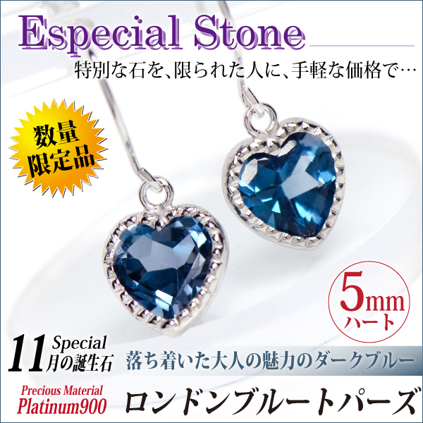 ロンドンブルートパーズ ピアス 送料無料 Pt900プラチナ 5mm ミル ハート フック 両耳ペア