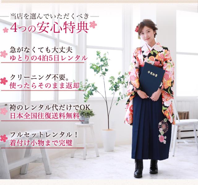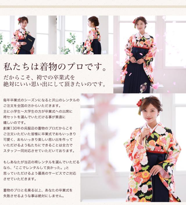 卒業式 袴 レンタル 2尺袖着物&袴 フルセットレンタル 安い 「黒地に雲取り松竹梅 桜 牡丹 鶴 鞠 さや形 綸子」