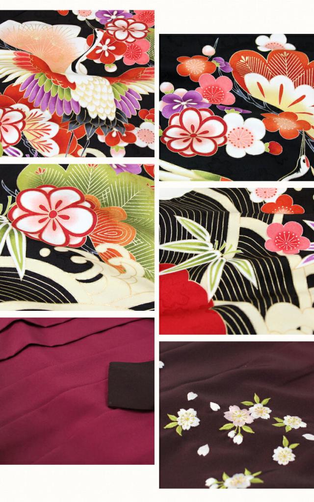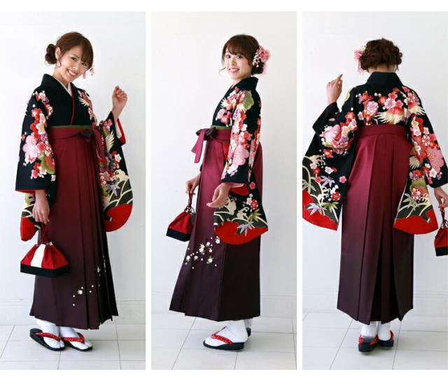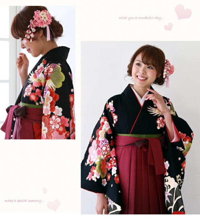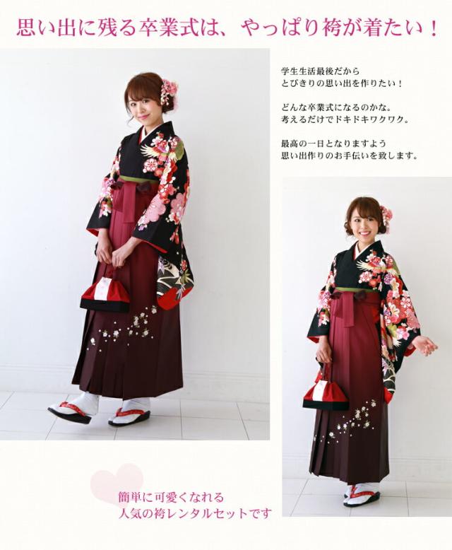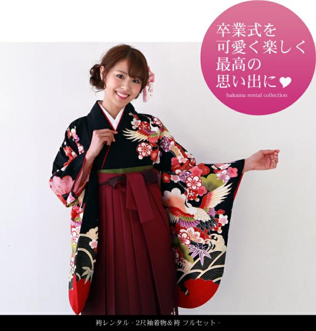 卒業式 袴 レンタル 女 袴セット 2尺袖着物&袴 フルセットレンタル 安い 「黒地に波と鶴 松 竹 梅 桜 綸子」
