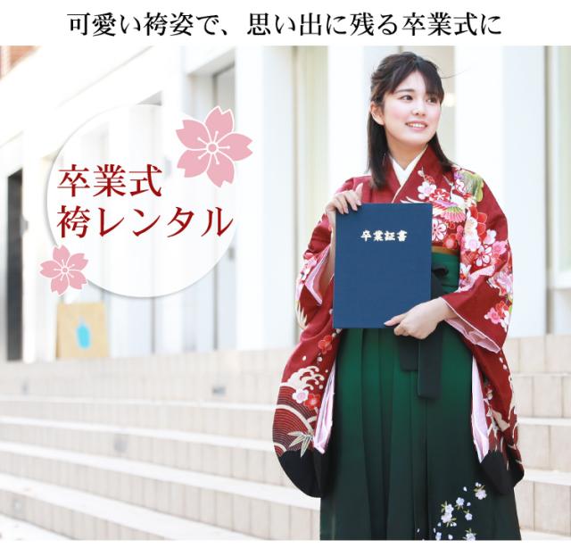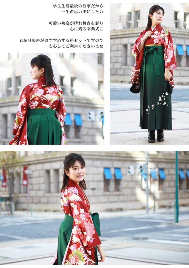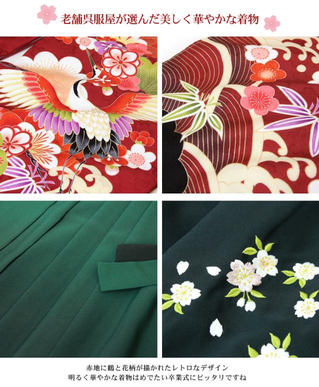 卒業式 袴 レンタル 女 袴セット 2尺袖着物&袴 フルセットレンタル 安い 「赤地に波と鶴 松 竹 梅 桜 綸子」