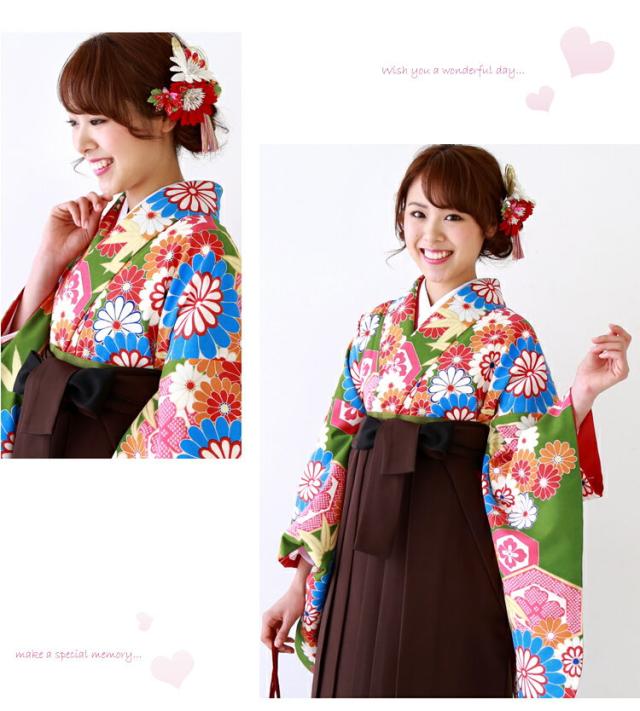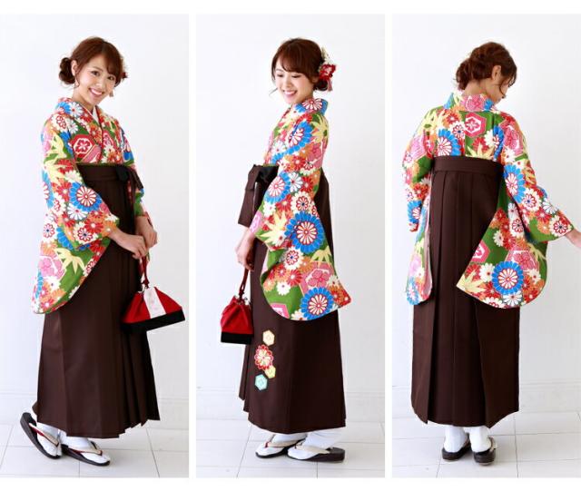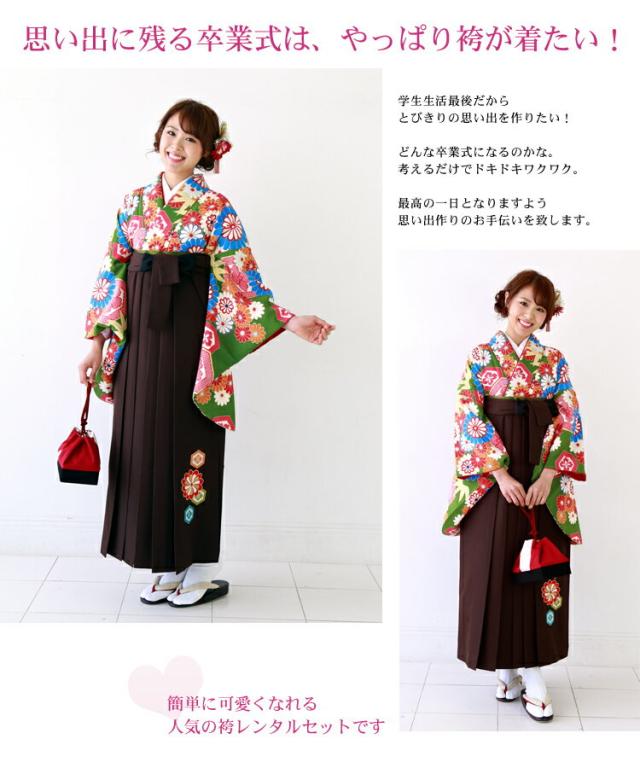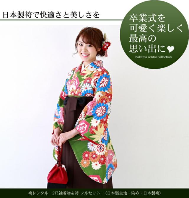 卒業式 袴 レンタル 女 袴セット 2尺袖着物&袴 フルセットレンタル 安い 「緑地に菊 竹 古典」