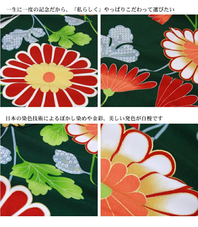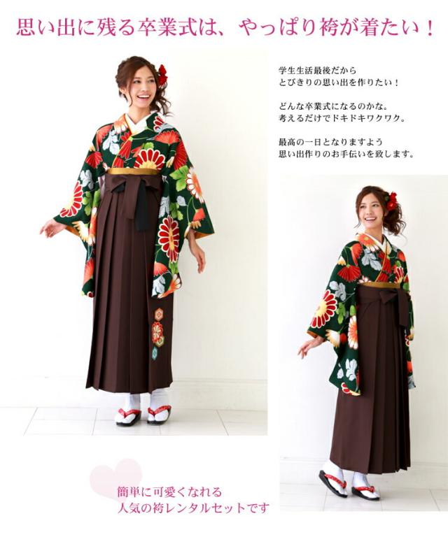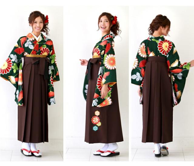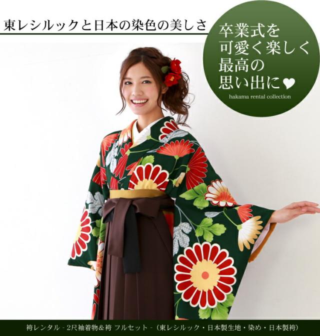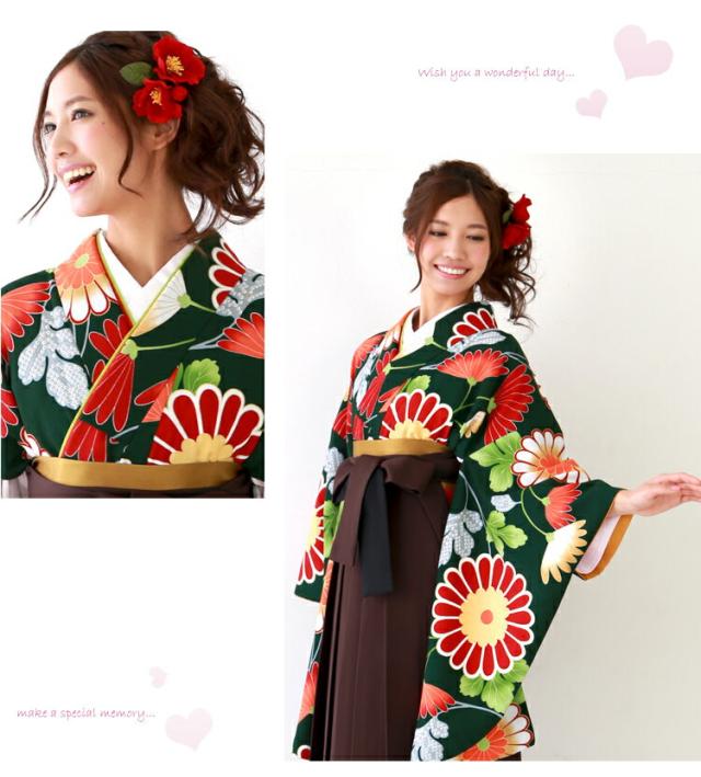 卒業式 袴 レンタル 女 袴セット 女 東レシルック 卒業式袴セット2尺袖着物&袴 「緑地にモダン赤・オレンジぼかし菊 グリーン」