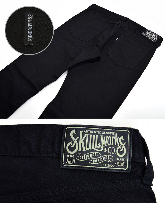 バック右ポケット縁には、ブランドロゴ入りのピスネームタグが縫い付けられています。パッチにも、スカルワークスらしいダークトーンを使用したロゴ入りのものを使用しました。