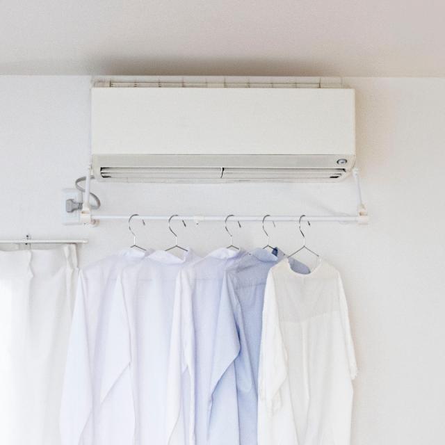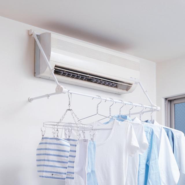 お部屋のエアコンの風を利用して、部屋干しの洗濯物を素早く乾かせる物干しハンガーです。暖房運転時には、お部屋の乾燥対策としても活躍します。エアコンにかけるだけの簡単設置で、いつでも気軽に使えます。
