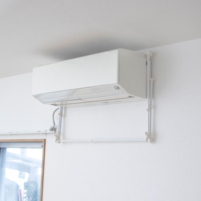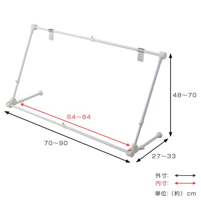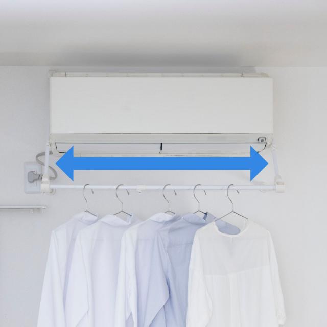 幅が伸縮できる設計で、約70〜90cmまで調整可能です(内寸幅:約64〜84cm)。さまざまなサイズのエアコンにフィットし、設置場所に合わせて安定して洗濯物を干せます。